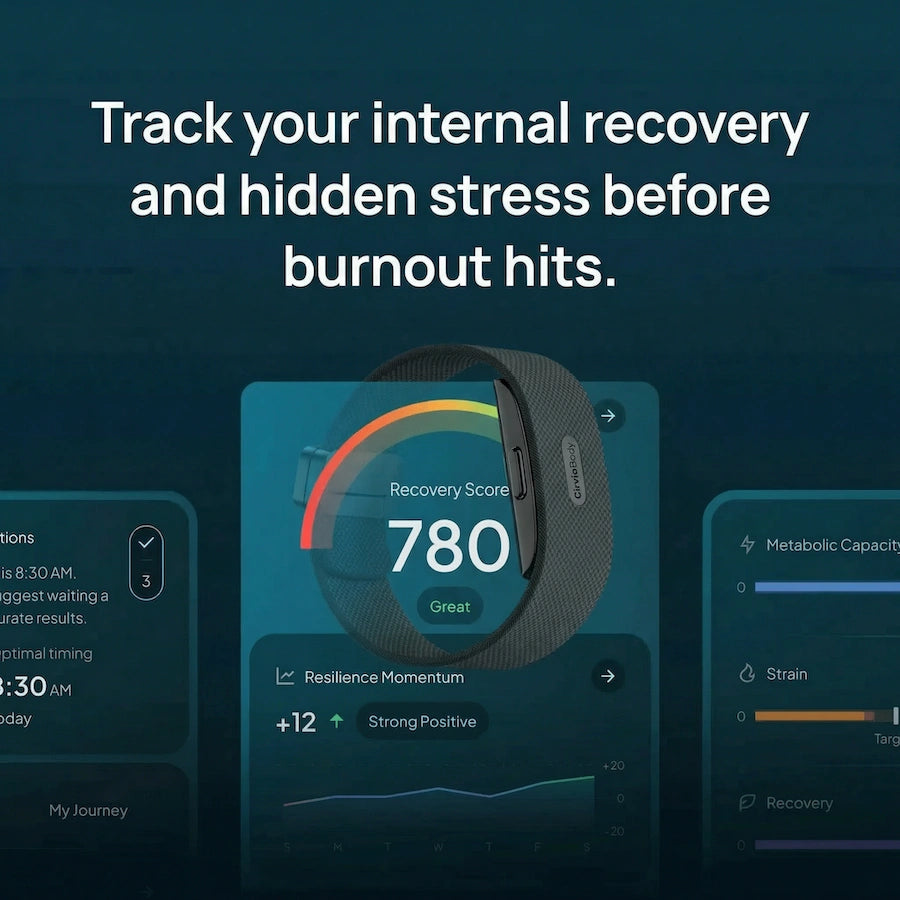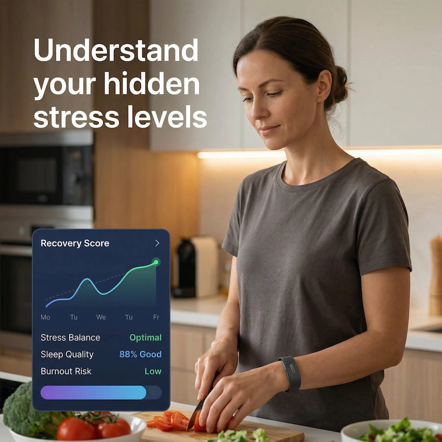 A: HRV, sleep stages, blood oxygen, skin temperature, heart rate, stress score, and recovery index. Together these metrics build a complete picture of how the body is actually functioning — not just how it appears in a single test.